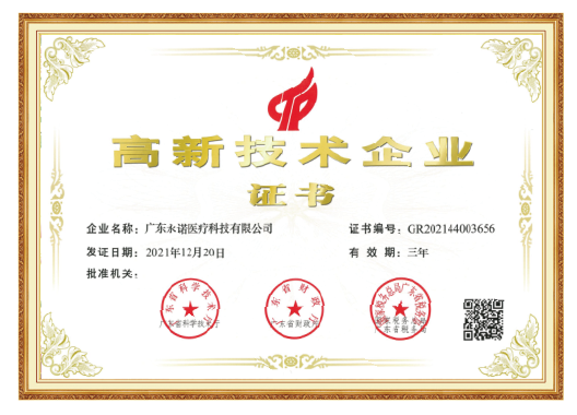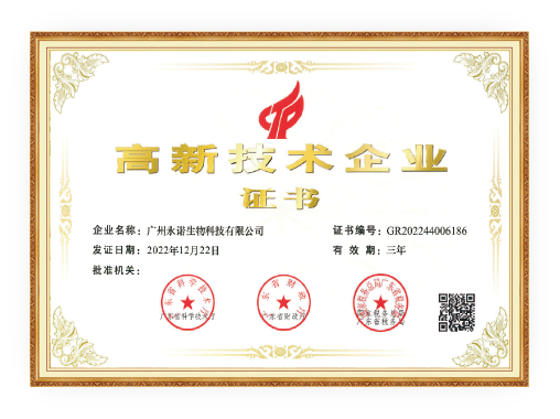 自成立以來,公司已公開申請專利66項,其中有57項已授權,廣東省名優高新技術產品2項。憑借強大的研發實力和創新能力,永諾生物成功入選大灣區生物科技創新企業50強、國家高新技術企業、廣州市科技創新小巨人企業、廣東省高新技術企業培育庫入庫企業、廣州市企業研發機構等榮譽。2023年永諾生物榮登首屆廣州百家新銳企業"銳100"名單;2024年公司榮獲"廣東省專精特新中小企業"稱號。